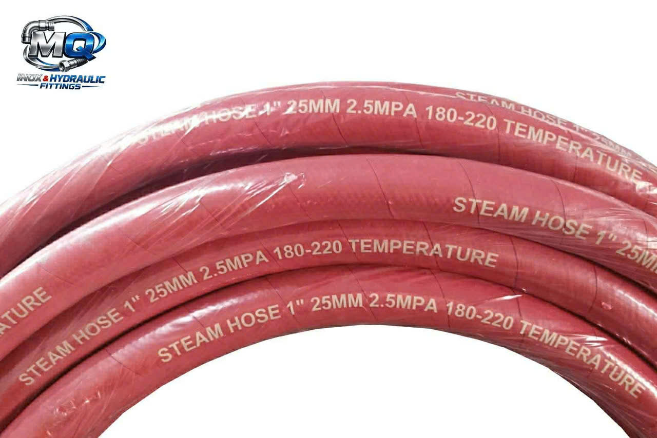 Tên sản phẩm: Ống chịu nhiệt Steam Hose Xuất sứ: China Các sản phẩm có sẵn: 1/2’’, 3/4”, 1”, 1.1/4”, 1.1/2” 1. Cấu tạo Lớp trong (Tube): Cao su EPDM hoặc cao su tổng hợp chịu nhiệt cao, chịu hơi nước bão hòa và nước nóng Lớp gia cường (Reinforcement): Sợi bố vải chịu nhiệt cao hoặc bố thép (textile braid / steel wire braid) Lớp ngoài (Cover): Cao su EPDM chịu nhiệt, chịu mài mòn, chống lão hóa, ozone và thời tiết 2. Thông số kỹ thuật chính Nhiệt độ làm việc: Hơi nước bão hòa: –40°C đến +210°C Một số loại đặc biệt: lên đến +232°C Áp suất làm việc (Working Pressure): Thông thường: 10 – 18 bar Áp suất nổ (Burst Pressure): ≥ 3 lần áp suất làm việc Đường kính trong (ID): Phổ biến: DN10 – DN50 (3/8” – 2”) Đường kính ngoài (OD): Phụ thuộc vào kích thước ID và số lớp bố gia cường Chiều dài tiêu chuẩn: 1 m đến 60 m hoặc cắt theo yêu cầu